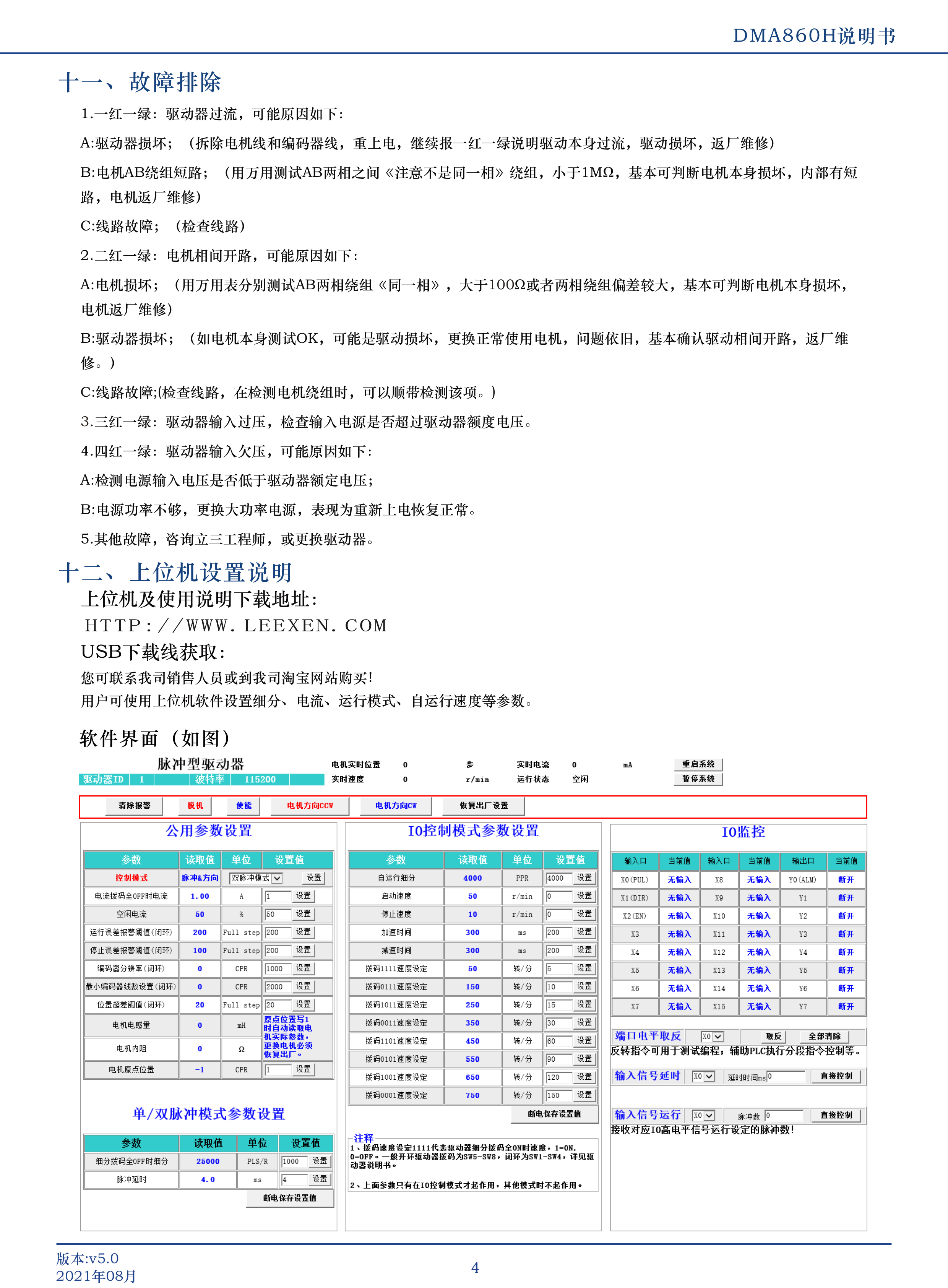 DMA860H是立成公司潛心研制的基于新一代基于32位DSP技術(shù)的高性能兩相數(shù)字式步進(jìn)驅(qū)動器,驅(qū)動電壓18-80VAC適配電流 8.2A以下,外徑86mm及以上的各種型號兩相混合式步進(jìn)電機(jī)。該驅(qū)動器采樣類似伺服的控制原理,獨特的電路設(shè)計,優(yōu)越的軟件算法處理,使電機(jī)即使在低細(xì)分下也能運行平穩(wěn),幾乎沒有振動和噪音,平滑、精確地電流控制技術(shù)大大減少了電機(jī)發(fā)熱,外置16檔等角度恒力矩細(xì)分,最高可調(diào)細(xì)分51200脈沖/轉(zhuǎn),光耦隔離差分信號輸入,抗干擾能力強(qiáng),具有過壓、欠壓、過流保護(hù)等出錯保護(hù)功能。在端子機(jī)、激光雕刻等中、低速應(yīng)用領(lǐng)域,其平穩(wěn)性、振動、噪聲性能優(yōu)勢明顯,可大大提高設(shè)備性能。