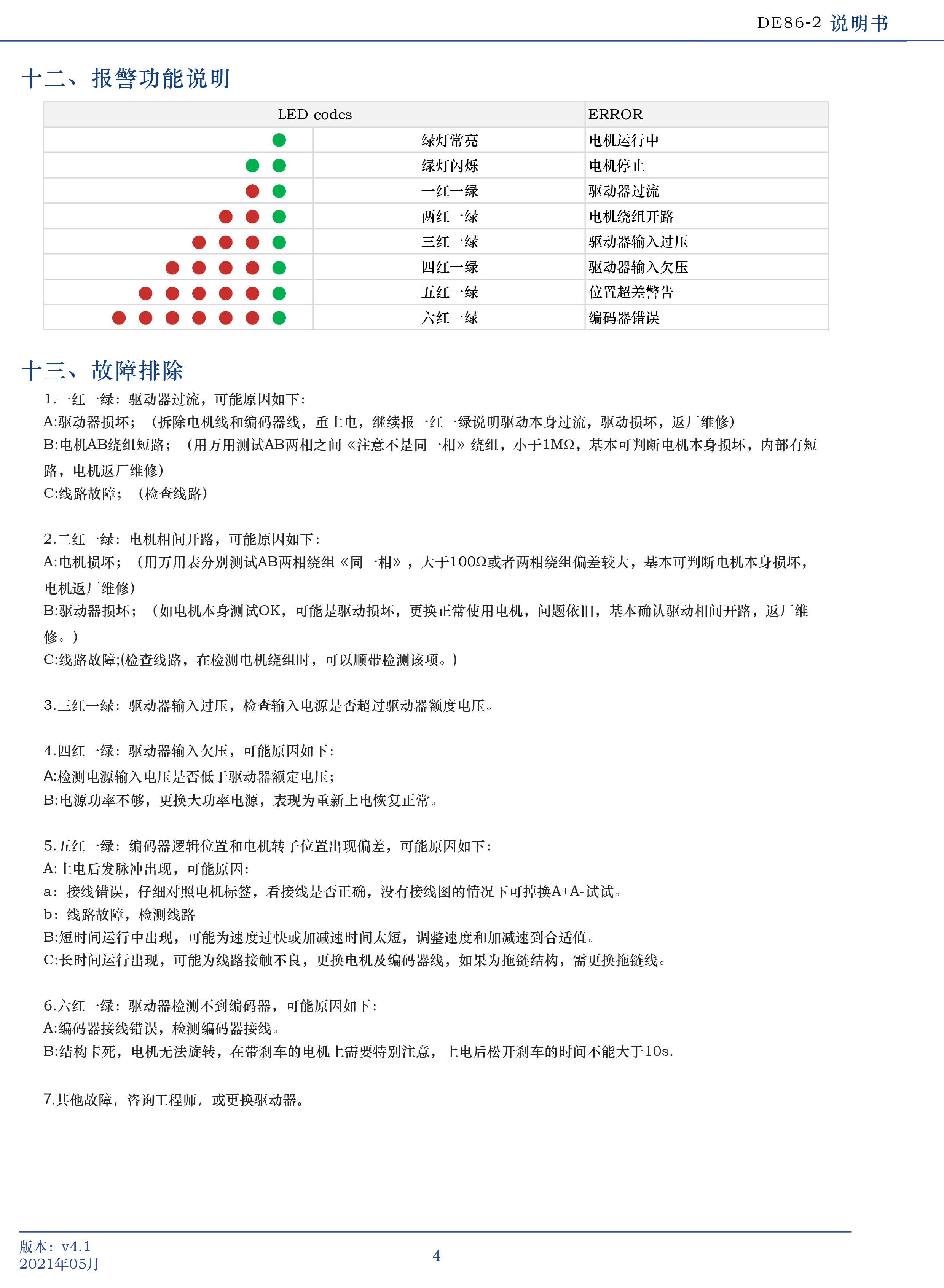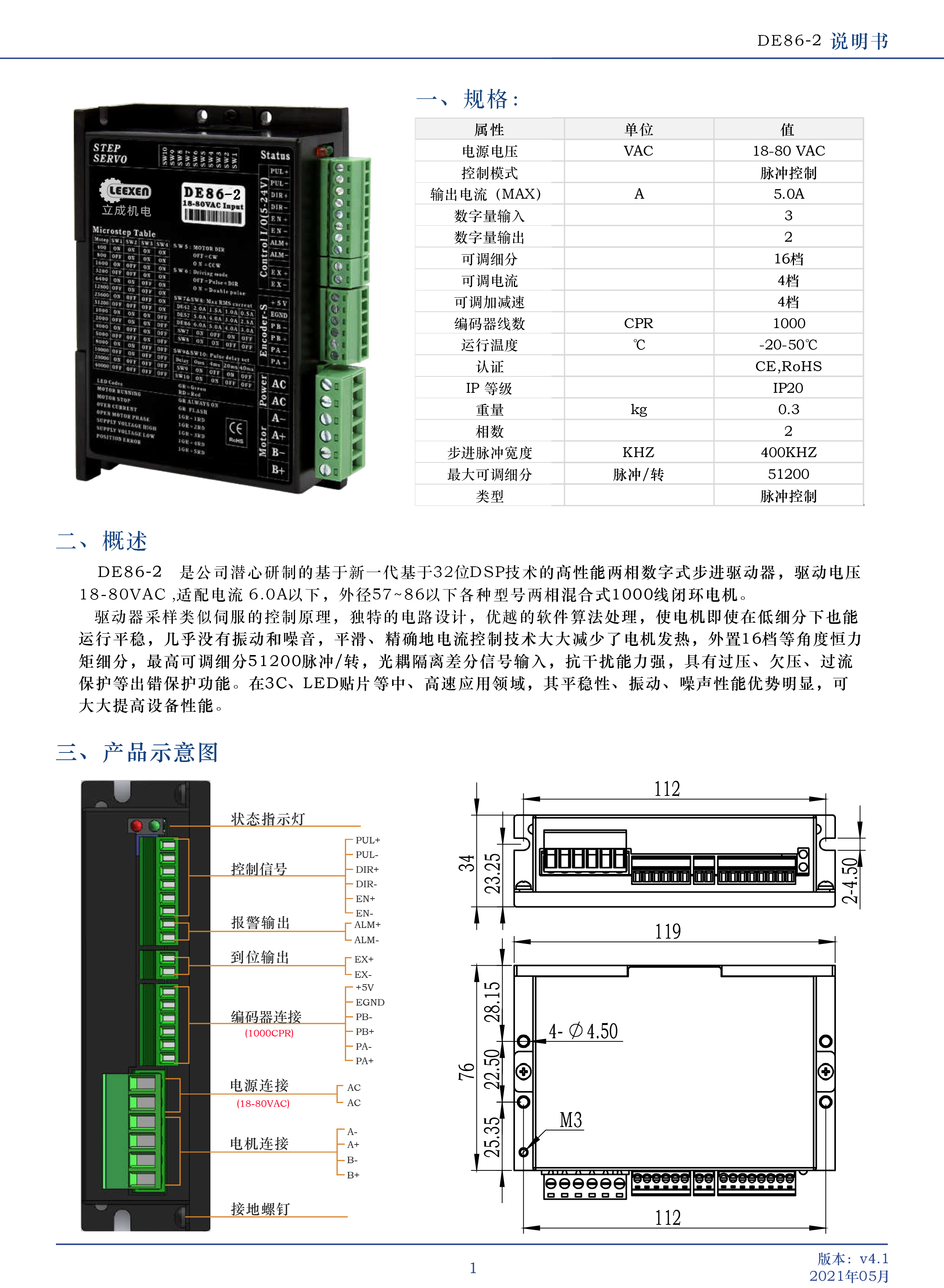 DE86-2 是公司潛心研制的基于新一代基于32位DSP技術(shù)的高性能兩相數(shù)字式步進(jìn)驅(qū)動(dòng)器,驅(qū)動(dòng)電壓18-80VAC 適配電流 6.0A以下,外徑57~86以下各種型號(hào)兩相混合式1000線閉環(huán)電機(jī)。驅(qū)動(dòng)器采樣類似伺服的控制原理,獨(dú)特的電路設(shè)計(jì),優(yōu)越的軟件算法處理,使電機(jī)即使在低細(xì)分下也能運(yùn)行平穩(wěn),幾乎沒有振動(dòng)和噪音,平滑、精確地電流控制技術(shù)大大減少了電機(jī)發(fā)熱,外置16檔等角度恒力矩細(xì)分,最高可調(diào)細(xì)分51200脈沖/轉(zhuǎn),光耦隔離差分信號(hào)輸入,抗干擾能力強(qiáng),具有過壓、欠壓、過流保護(hù)等出錯(cuò)保護(hù)功能。在3C、LED貼片等中、高速應(yīng)用領(lǐng)域,其平穩(wěn)性、振動(dòng)、噪聲性能優(yōu)勢(shì)明顯,可大大提高設(shè)備性能。